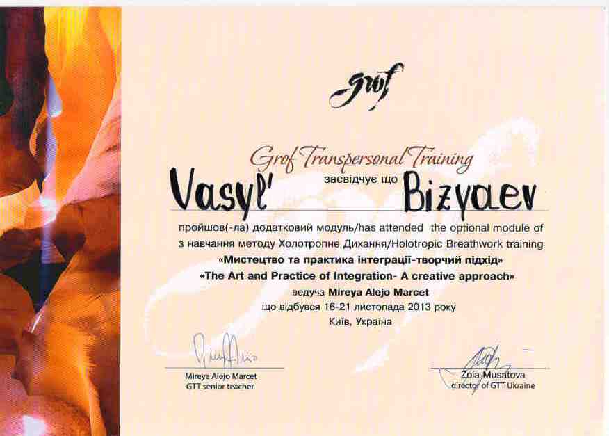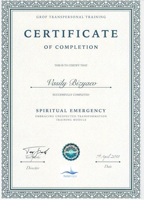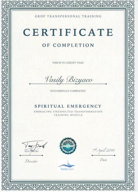 - Участник сертификационной программы по холотропному дыханию (Grof Transpersonal Training)