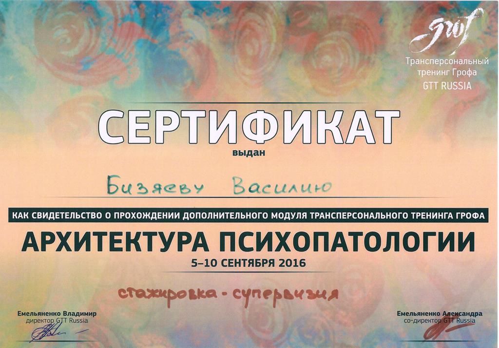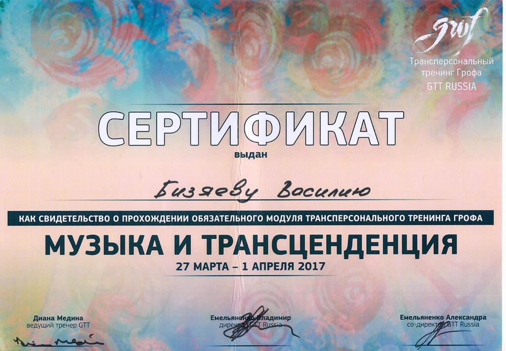 - Сертифицированный ведущий Grof Transpersonal Training(GTT)
