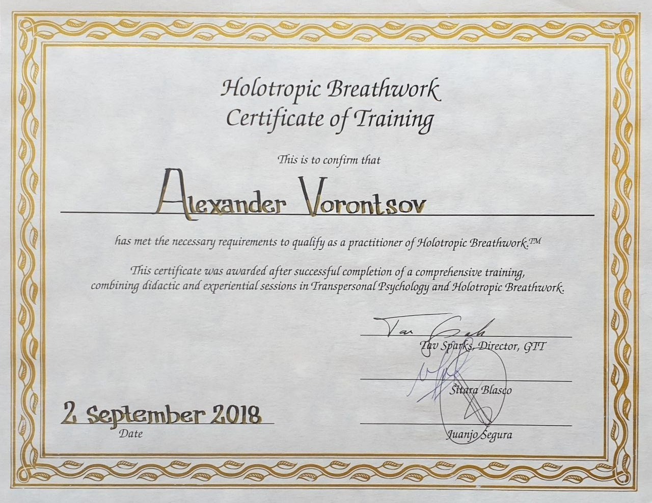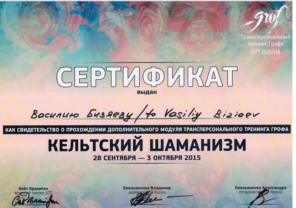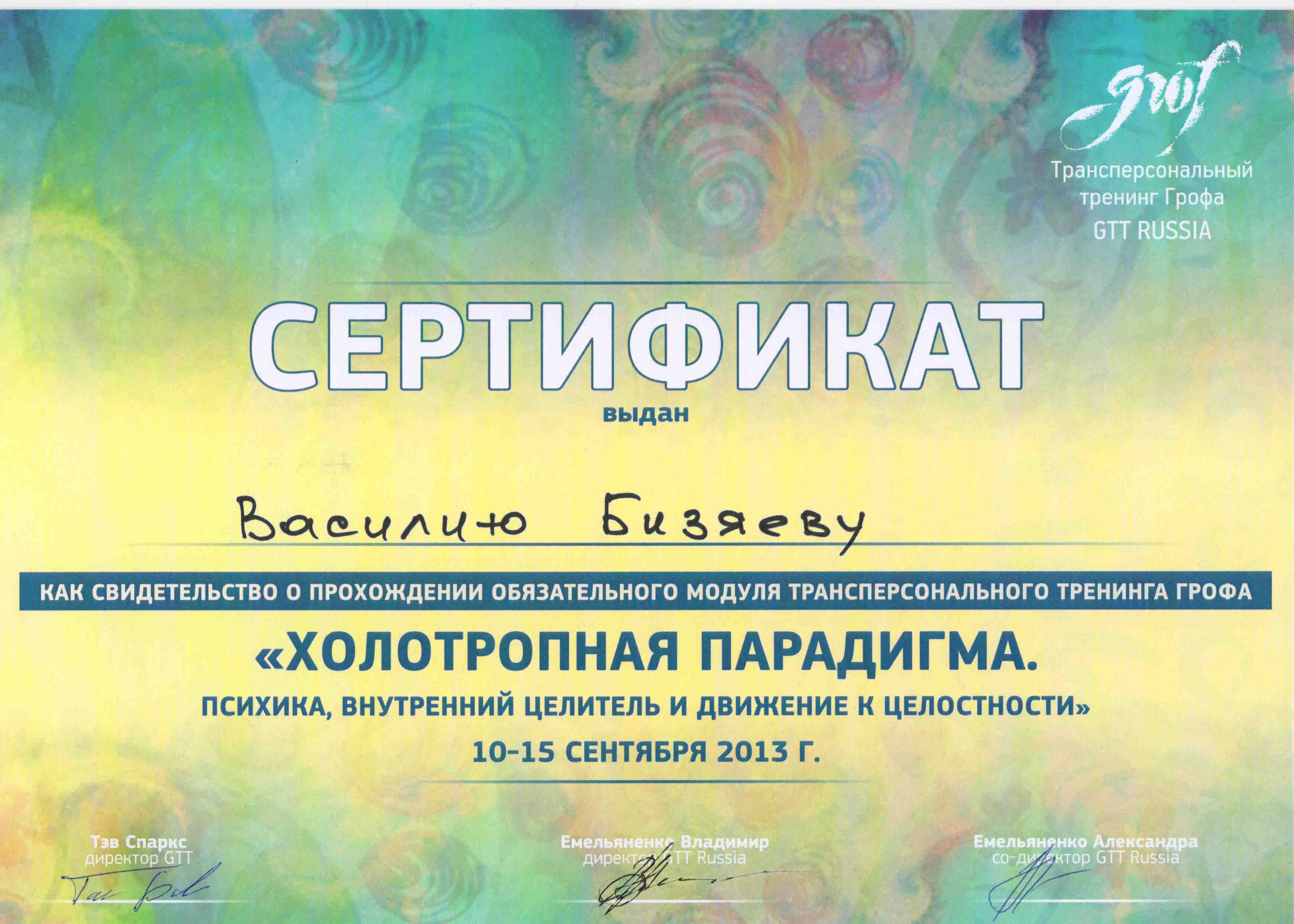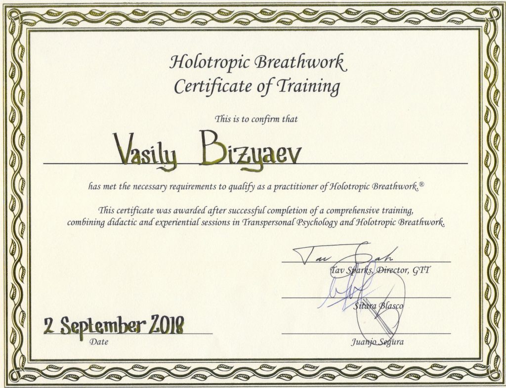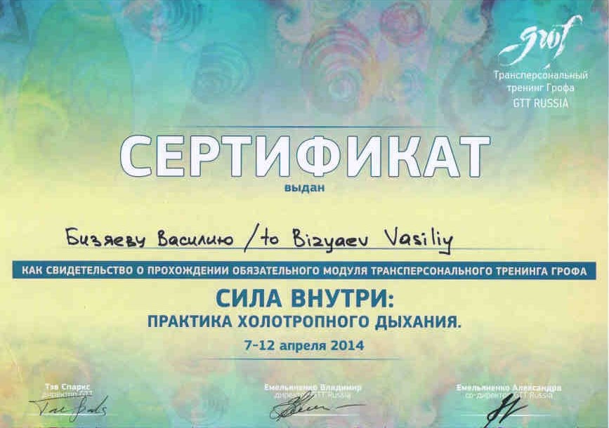 - международный сертификат по Холотропному Дыханию стандарт GTT от 2014 г